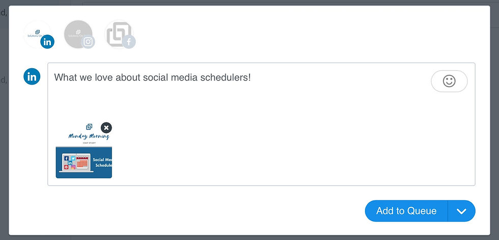 In the sample image below, you can see a post drafted first just for LinkedIn. The Instagram and Facebook icons are greyed out, so the post will only go to our LinkedIn account.